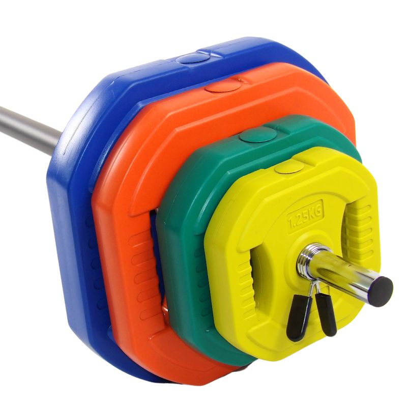 Bodypump-set - Skivstångssetet består av 8 viktskivor tillverkade av solid plast med cementfyllning inuti. Dessa viktskivor tål inte att falla i golvet.
