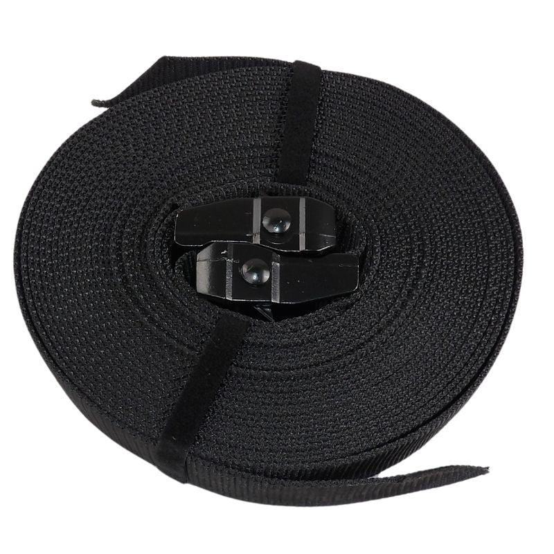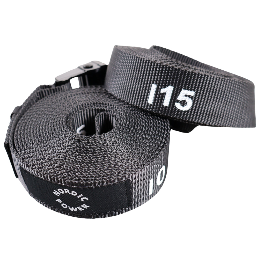 OBS: Se till att dra remmen åt rätt håll genom låset. Om du installerar den på fel sätt kommer remmen bara att löpa genom låset när du lägger vikt på ringarna. Så testa detta innan du lägger maximal vikt på. När låset är korrekt installerat kommer det att dra åt ordentligt mot remmen och det sitter säkert.