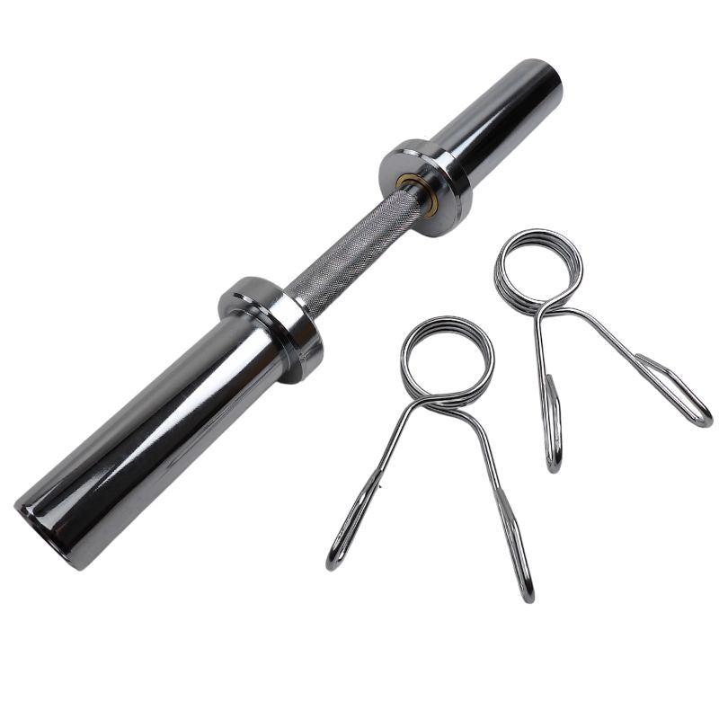 En uppsättning fjäderklämmor ingår i denna hantelstång.